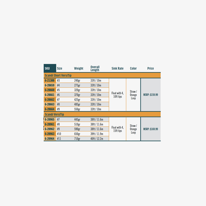 RIO's Scandi Short VersiTip is a highly versatile, interchangeable tip Scandi style shooting head, that allows anglers to change tips quickly and easily as fishing conditions change. It is ideal for the travelling angler, so that they can travel light, yet be prepared for any condition. The package includes a 23ft floating Scandi body and four, 10ft long interchangeable tips, making a total head length of 33ft. The included tips in each package are floating, intermediate, type 3 and type 6 DC sink.